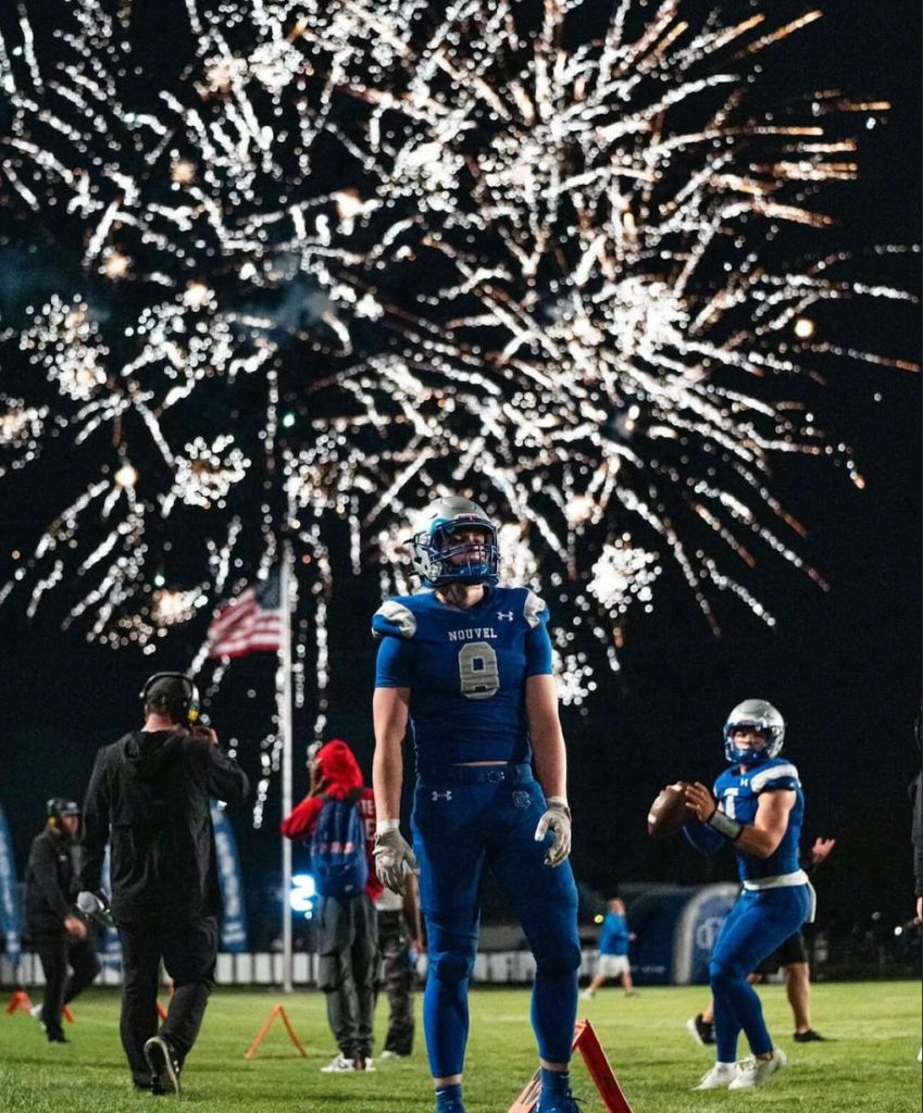 Nouvel’s 2025 football team put on a show in their week 4 homecoming game against Michigan Lutheran Seminary (MLS). Their dominant defense held the cardinals only to 14 points, and their forceful offense led the game with 27 points. Fireworks were provided by Charlie Haddad, the fireworks soared through the night at the climax of every touchdown. Also lasting a 3 minute show at halftime after the crowning of the Homecoming Queen. John Carlson was crowned king earlier that day at the annual homecoming assembly. Sydney Leslie, the previous queen from 2024 had the honor to crown this year’s queen at halftime. Passing the torch to Natalie Shaheen at halftime. The crowning was by far the highlight of the night. The highly anticipated game was an opportunity for redemption with the notion that Nouvel beat MLS last year in their first meeting 23 to 14, and went on to go 9-0 last year until their 2nd meeting with MLS in the first round of playoffs. Father Adam and Father Steve were in attendance cheering on their panthers from the sideline. Nouvel fell short to MLS 20 to 23 ending their season with a distasteful feeling toward the team they couldn’t beat twice. The Panthers current record falls at 3-1.